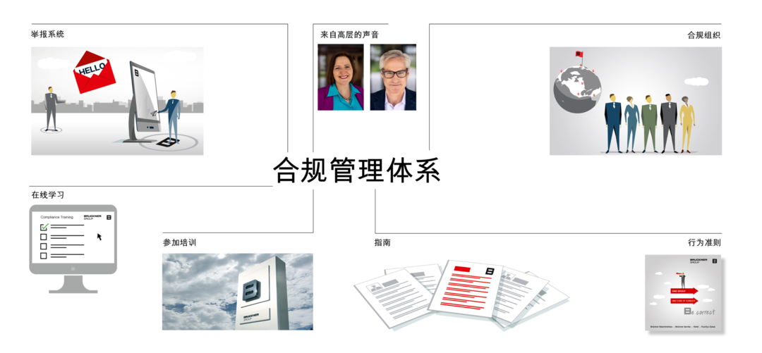 遵守现行法律法规、遵循道德准则、与同事或商业伙伴交往时始终秉承负责任的行为方式,这些是我们的首要任务。为防止违反这些原则,我们建立了全球合规管理系统,以下是此合规管理系统的支柱: